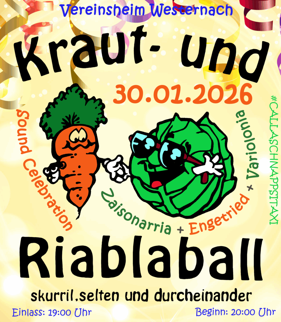 Auch heuer sind wir wieder am Start mit unserem legendären Kraut- und Riablaball. Feiert mit uns den besten Fasching aller Zeiten, lasst euch von der Zaisonarria begeistern, rockt zu der Musik von Sound Celebration. Mit dabei ist heuer auch die Garde aus Engetried und die Variolonia die euch jeweils einen Teil ihres Programms zeigen. Wer es mit dem Tanzen nicht so hat, für den gibt’s natürlich auch was Leckeres an der Bar. Also kommt zu uns und lasst es krachen.